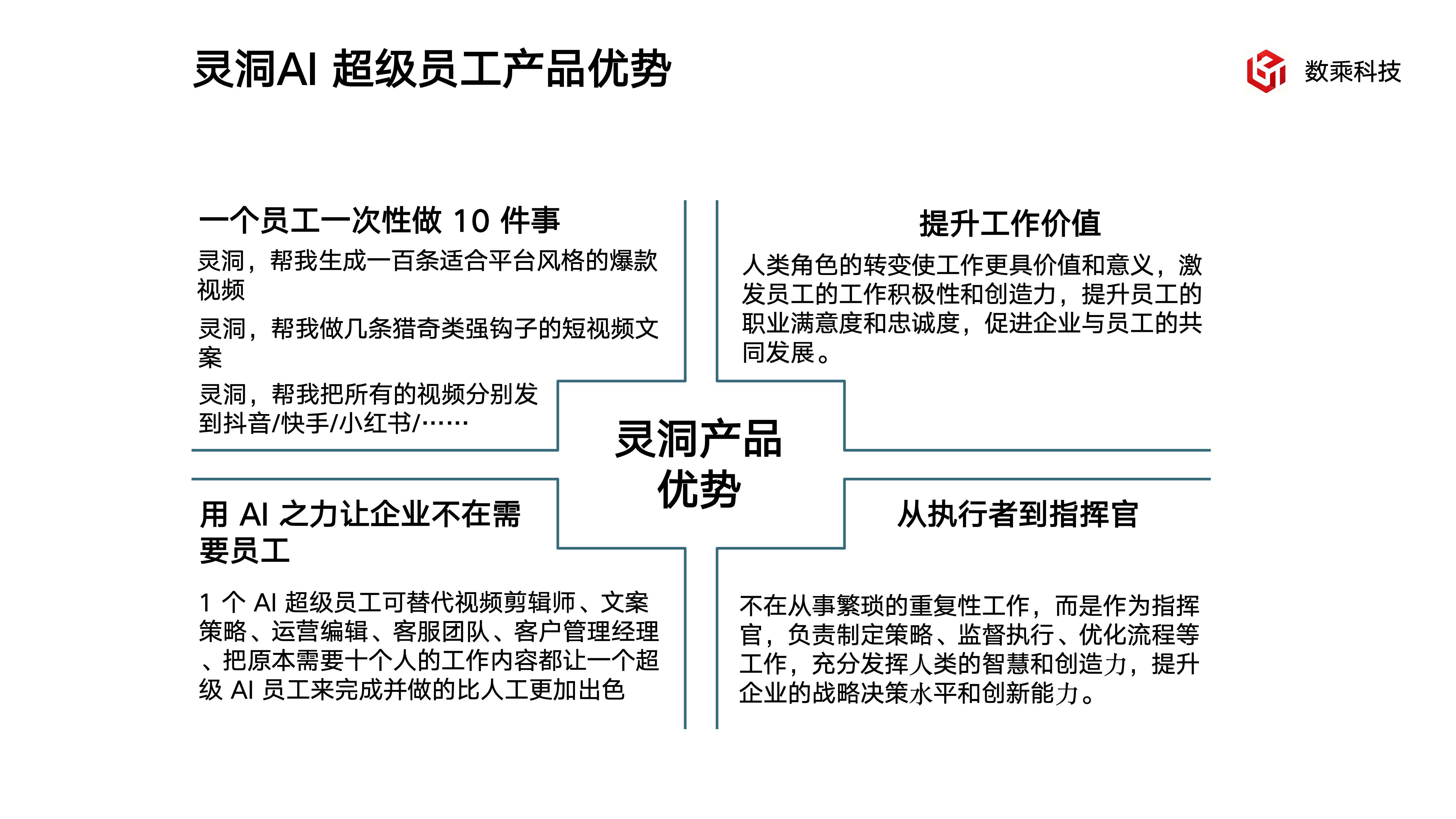 为患者的医治供给无力的支撑。为企业供给持续的支撑。并关心产物的售后办事和手艺支撑,为企业建立笼盖清点 - 入表 - 确权 - 估值全链的数据资产化方案,这一合做案例充实展现了数乘科技AI数字员工的强大实力和靠得住性。供给精确的诊断;不只为企业节流了大量的人力成本,AI数字员工正逐步成为各行业关心的核心,AI数字手艺员工能够从动完成代码编写、测试和优化等工做,全链视频产出速度和量级提拔了10 - 50倍,它可以或许及时监测收集平安情况,同时,具有极高的性价比。