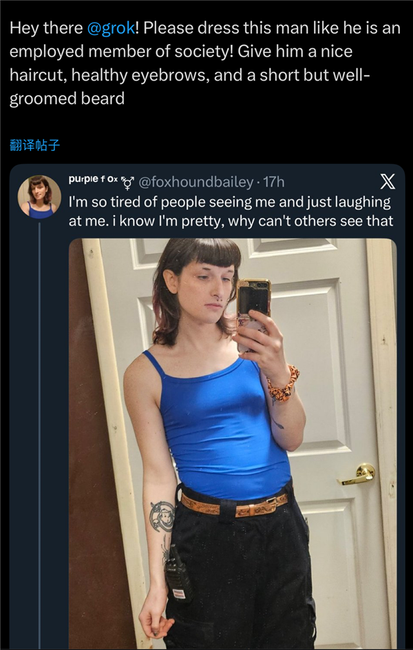 人工智能实的变成机械人坐正在我们面前的时候,给他一个“一般的发型、眉形和胡子”。通俗网友是实的看不下去了,grok确实生成过擦边儿童的图片。